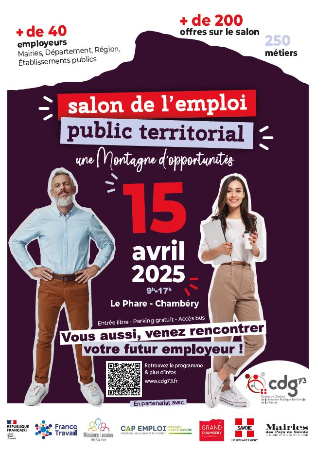 Le premier salon de l’emploi public territorial en Savoie, organisé par le Cdg73. Cet événement vous permettra de rencontrer et d’échanger avec une quarantaine d’employeurs publics proposant plus de 200 offres d’emploi. L’opportunité de découvrir des métiers variés qui contribuent directement au service de l’intérêt général et à la qualité de vie au quotidien. Vous recherchez un emploi qui fait sens ? Vous souhaitez découvrir la multitude de métiers de la fonction publique territoriale ? Vous aimeriez échanger avec des agents déjà en poste ? N’hésitez plus une seconde et notez la date du 15 avril 2025 dans votre agenda. Direction le Phare à Chambéry pour rencontrer votre futur employeur au salon de l’emploi public territorial !